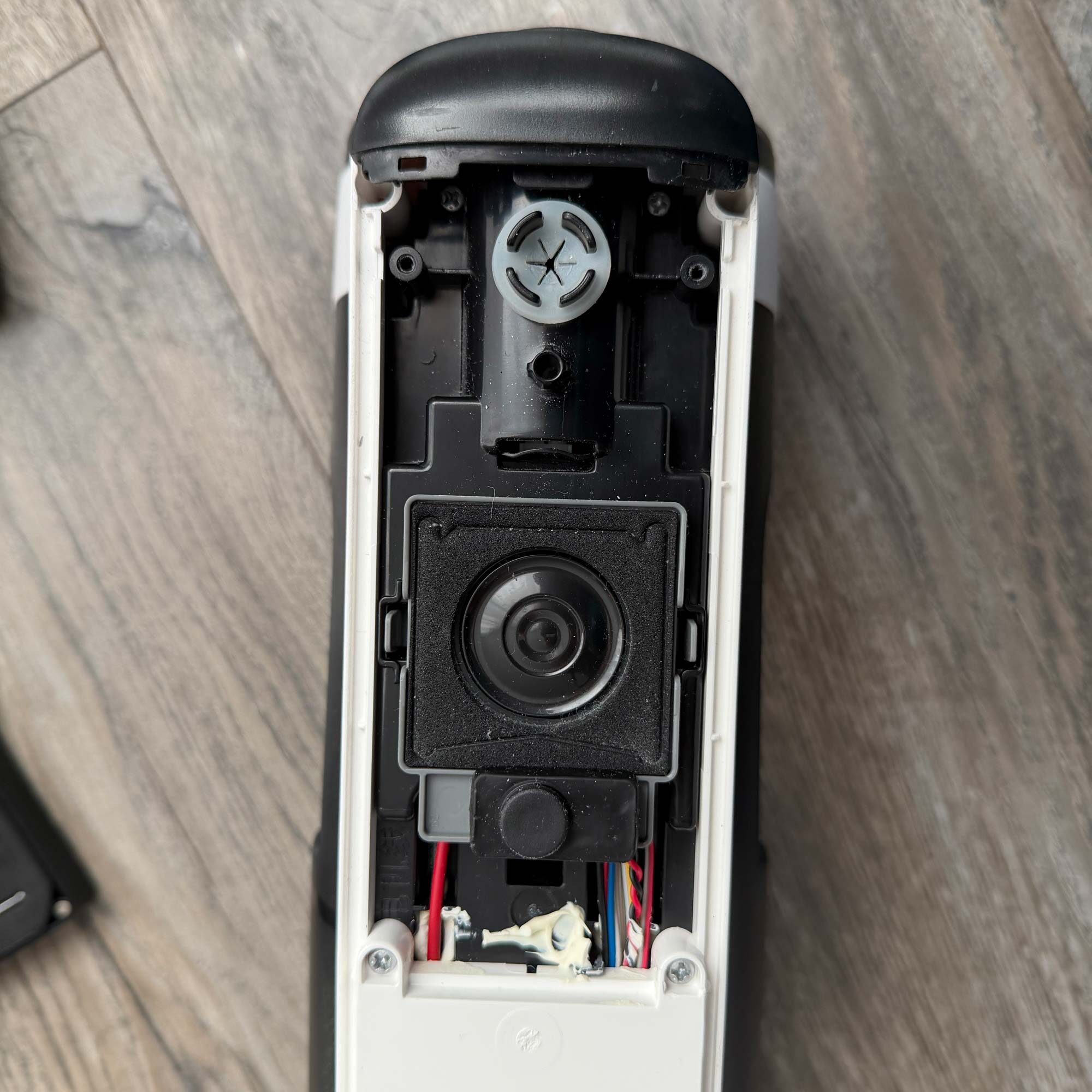 Um die weiße Abdeckung entfernen zu können, müssen 4 Schrauben gelöst werden. Bei den oberen Schrauben muss dazu das schwarzes Gehäuse etwas nach oben weggedrückt werden. So kommt man einfacher an die Schrauben. Nach dem die Schrauben gelöst wurden, können die seitlichen Teile etwas angehoben werden und können zur Seite gelöst werden. Dabei muss das schwarzes Gehäuse ganze Zeit nach oben weggedrückt werden.